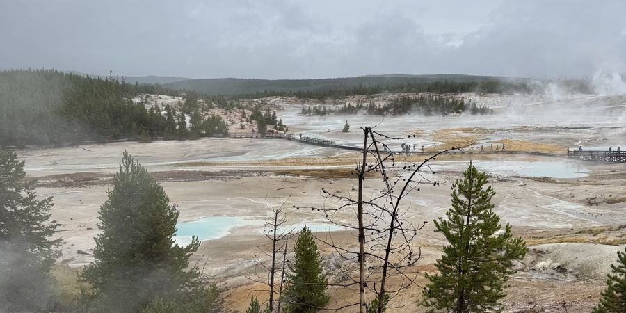 Ook tijdens dit tweede bezoek aan Yellowstone was ik diep onder de indruk. Vooral de afwisseling van het landschap is groot. Onder Yellowstone zit bijvoorbeeld een megavulkaan, een zogenaamde complexe kaldera, dicht onder de oppervlakte. Het is eigenlijk een soort reuze-kom of pannenkoek waarin het park ligt, dus niet een berg die omhoog rijst. Er is een rondweg in het park in de vorm van een 8, en hieromheen liggen de 8 gebieden van het park (tevens de hoogtepunten). We bezochten er een aantal van, zoals Norris Basin met een groot aantal bronnen, geisers, modderpoelen en stoomgaten.